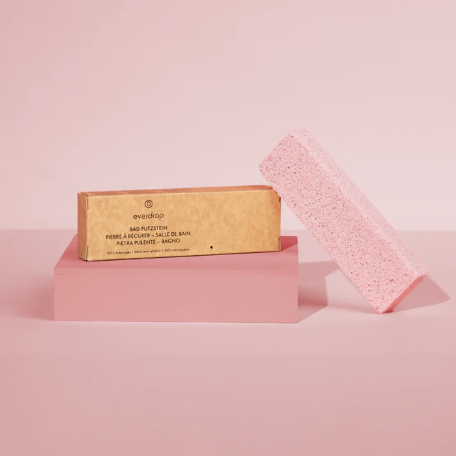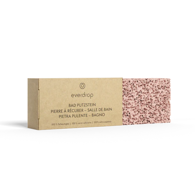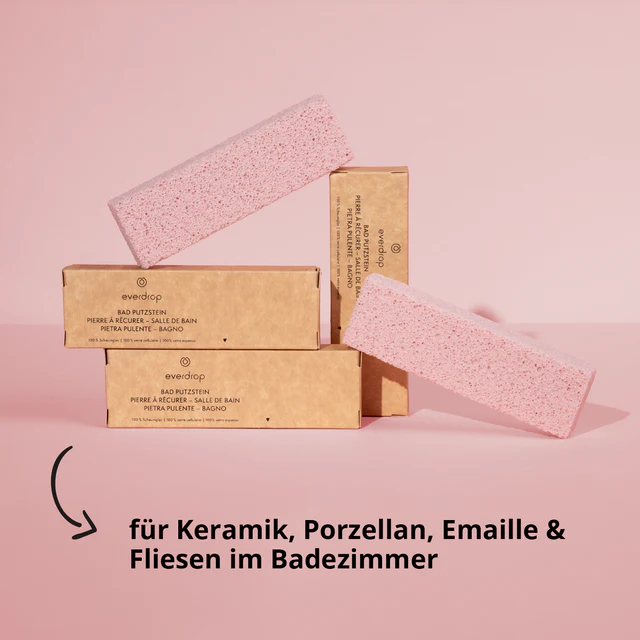 Mit dem everdrop Bad-Putzstein kannst du nicht nur sehen, sondern auch hören wie der Schmutz weniger wird. Obwohl die Anwendung manchmal etwas „kratzig“ klingt, reinigt das Produkt schonend und ohne die Oberfläche zu verkratzen. Der Grund für das ungewohnte Geräusch ist die poröse Struktur des Putzsteins, die Ablagerungen abträgt und eine abschleifende Wirkung hat.
