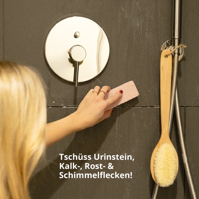 Mit dem Bad-Putzstein werden selbst hartnäckigste Verschmutzungen ganz ohne aggressive Chemiekeulen entfernt. Durch seine poröse Struktur trägt er Ablagerungen effektiv ab und entfernt sie nachhaltig.